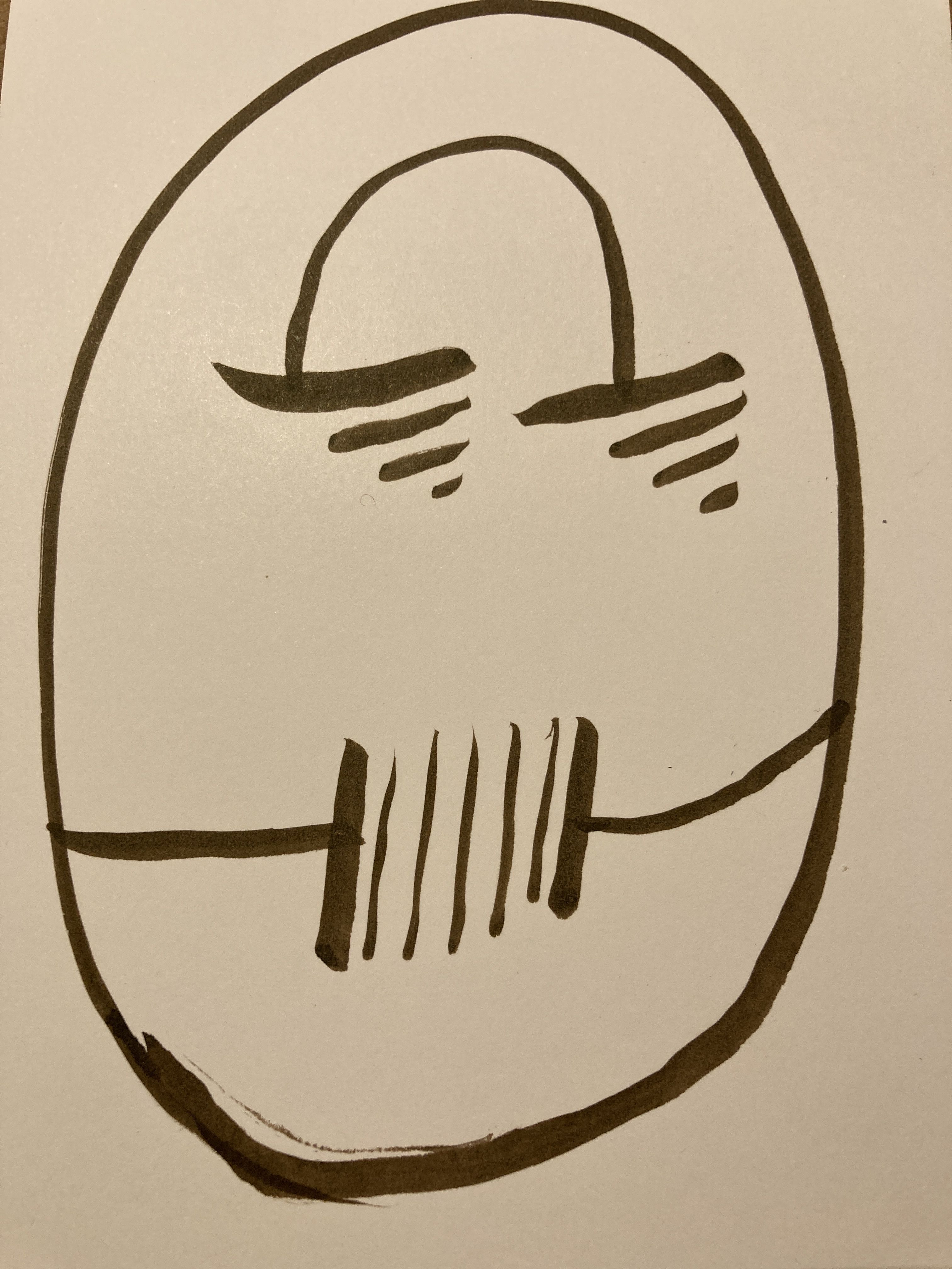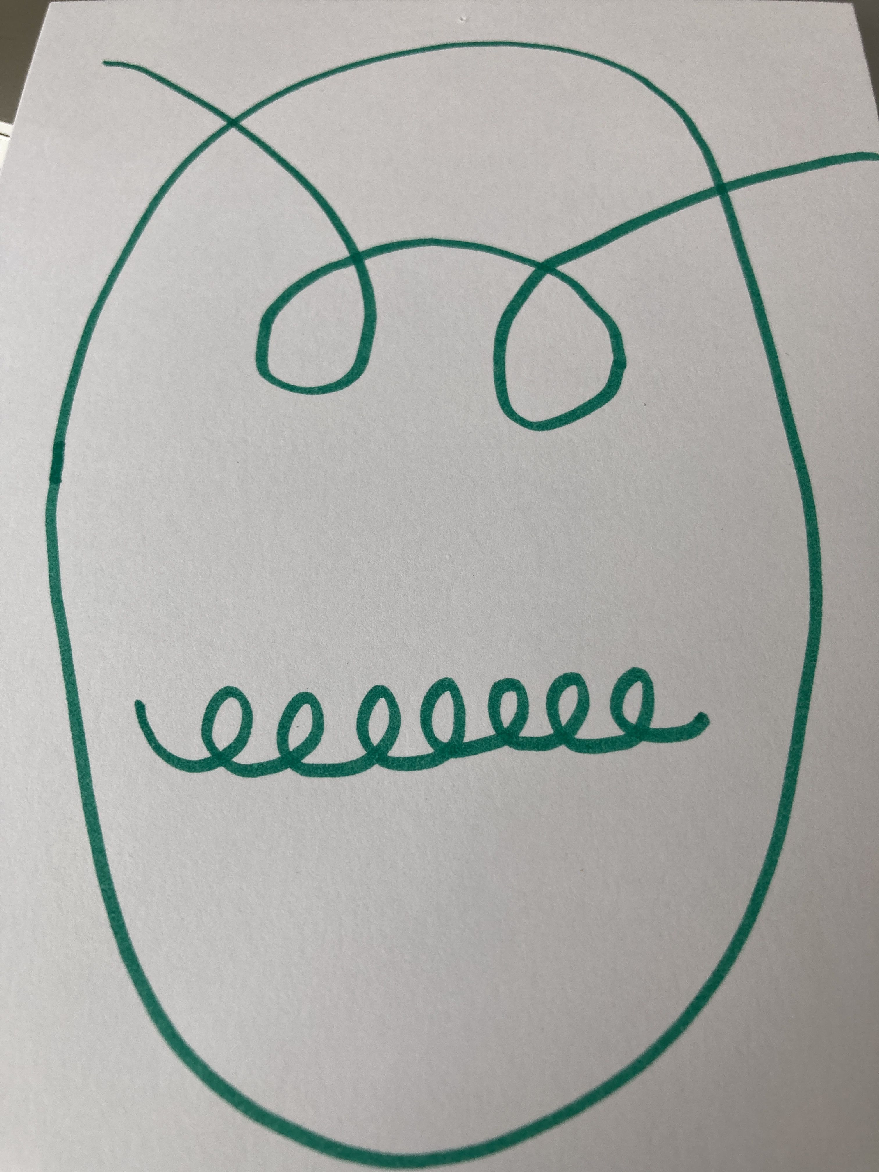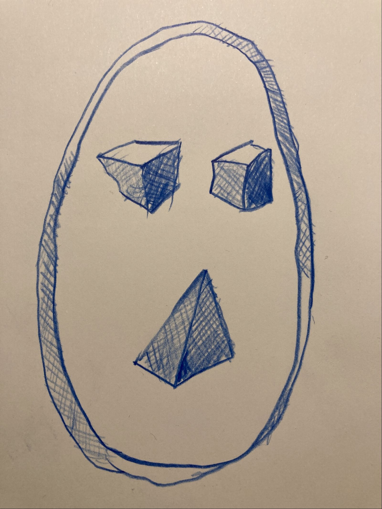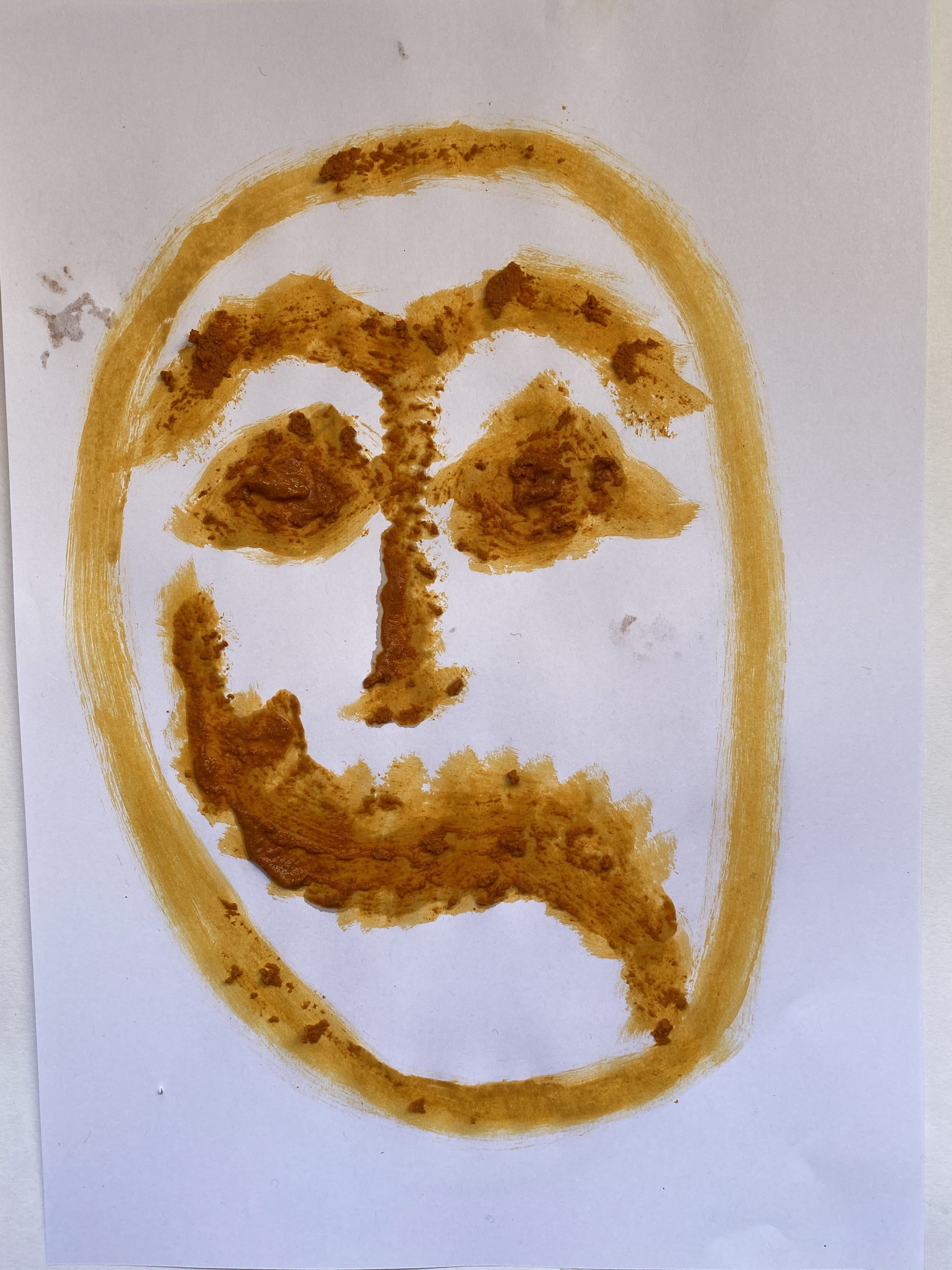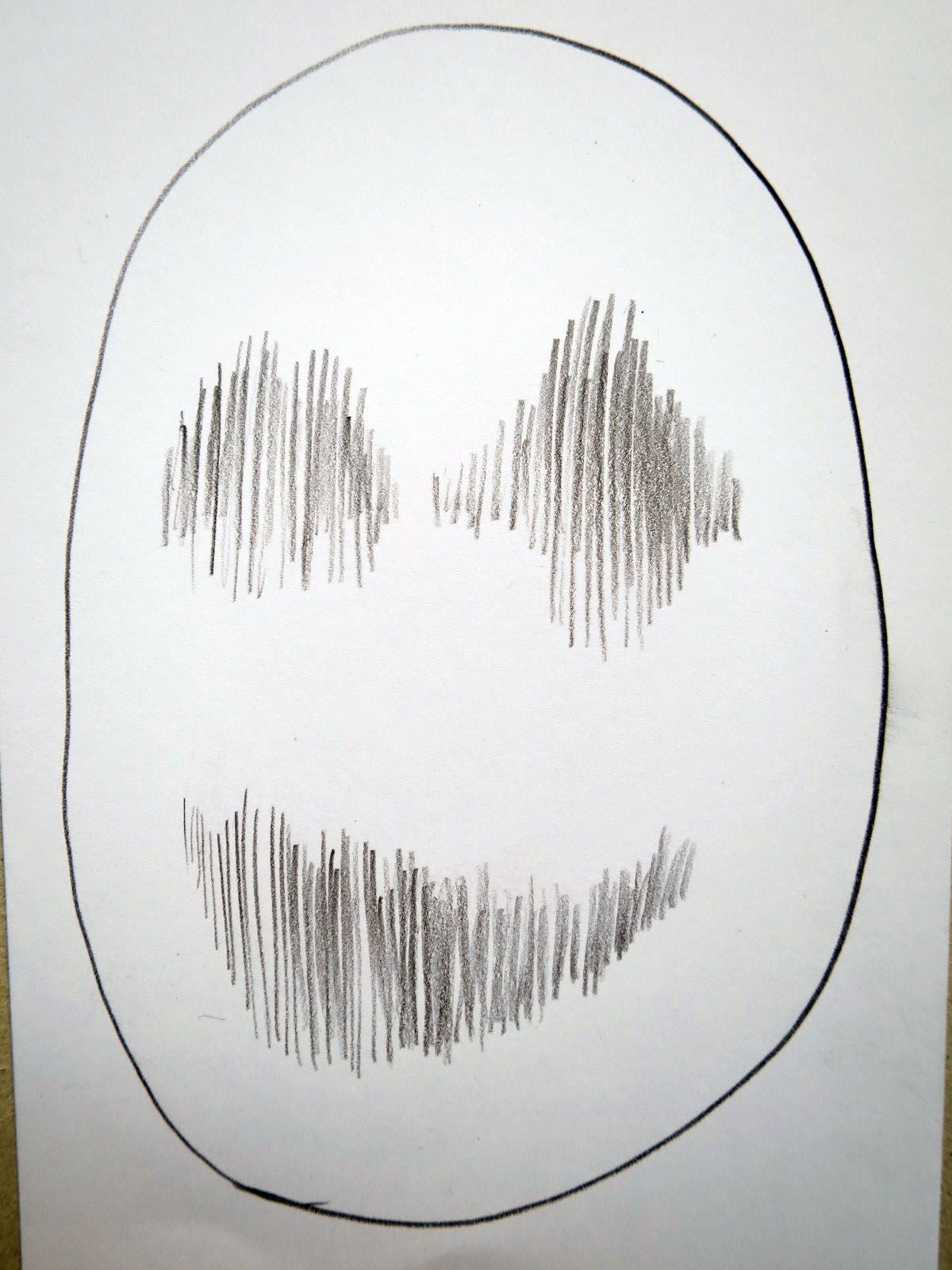 Zeichne ein Oval im Hochformat und ergänze es mit Formen so dass ein bizarres Gesicht zu erkennen oder zu erahnen ist. Das Bild kann gezeichnet, geklebt, gemalt, gelegt, gestempelt oder ... werden.