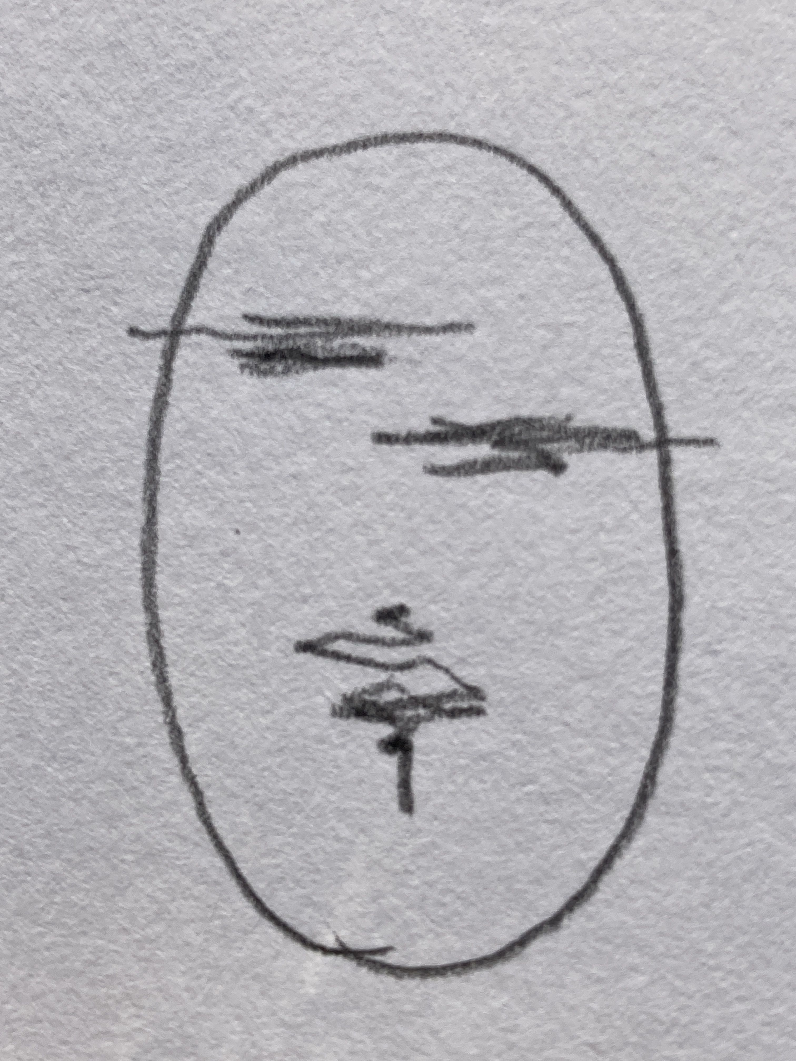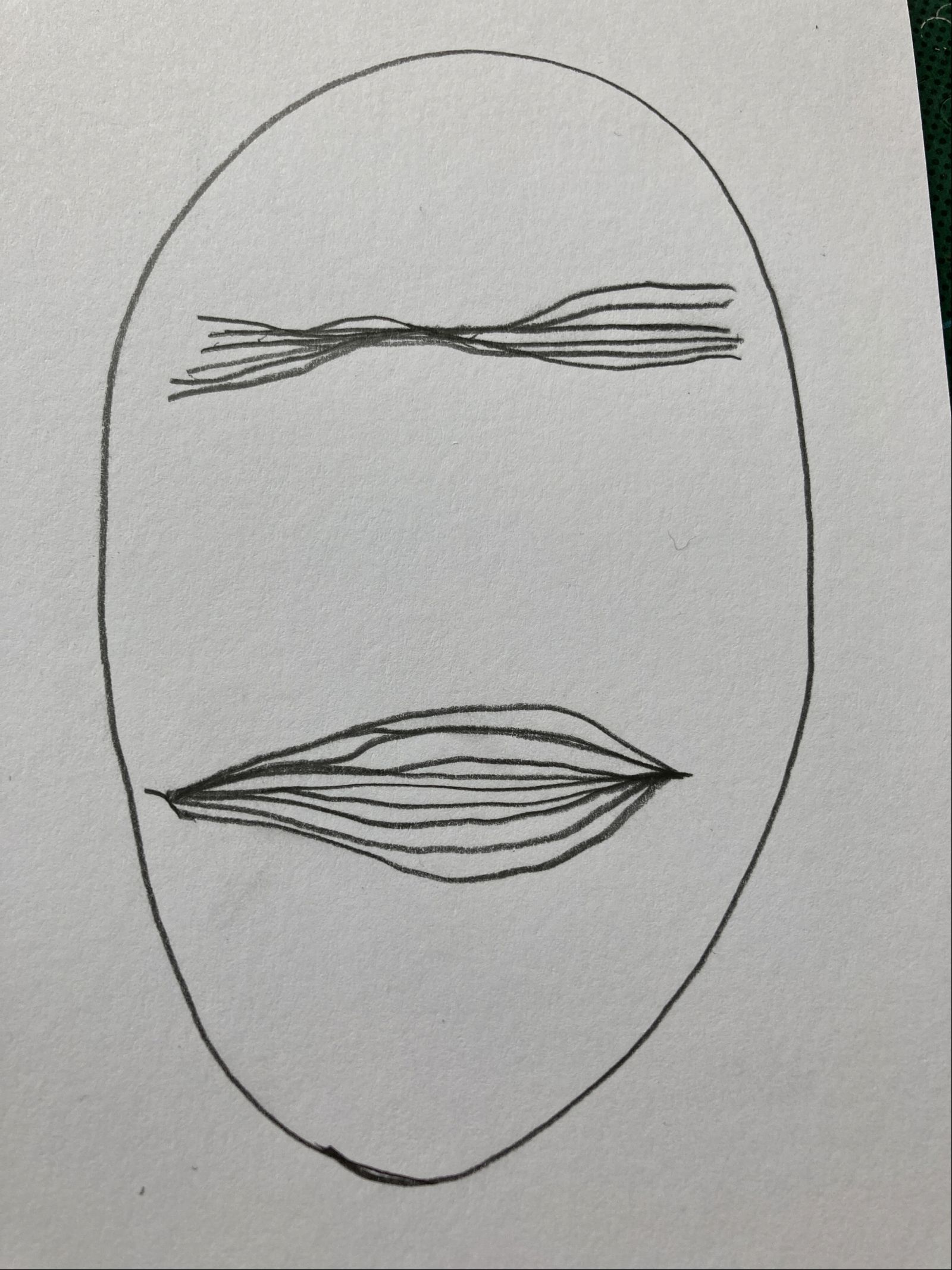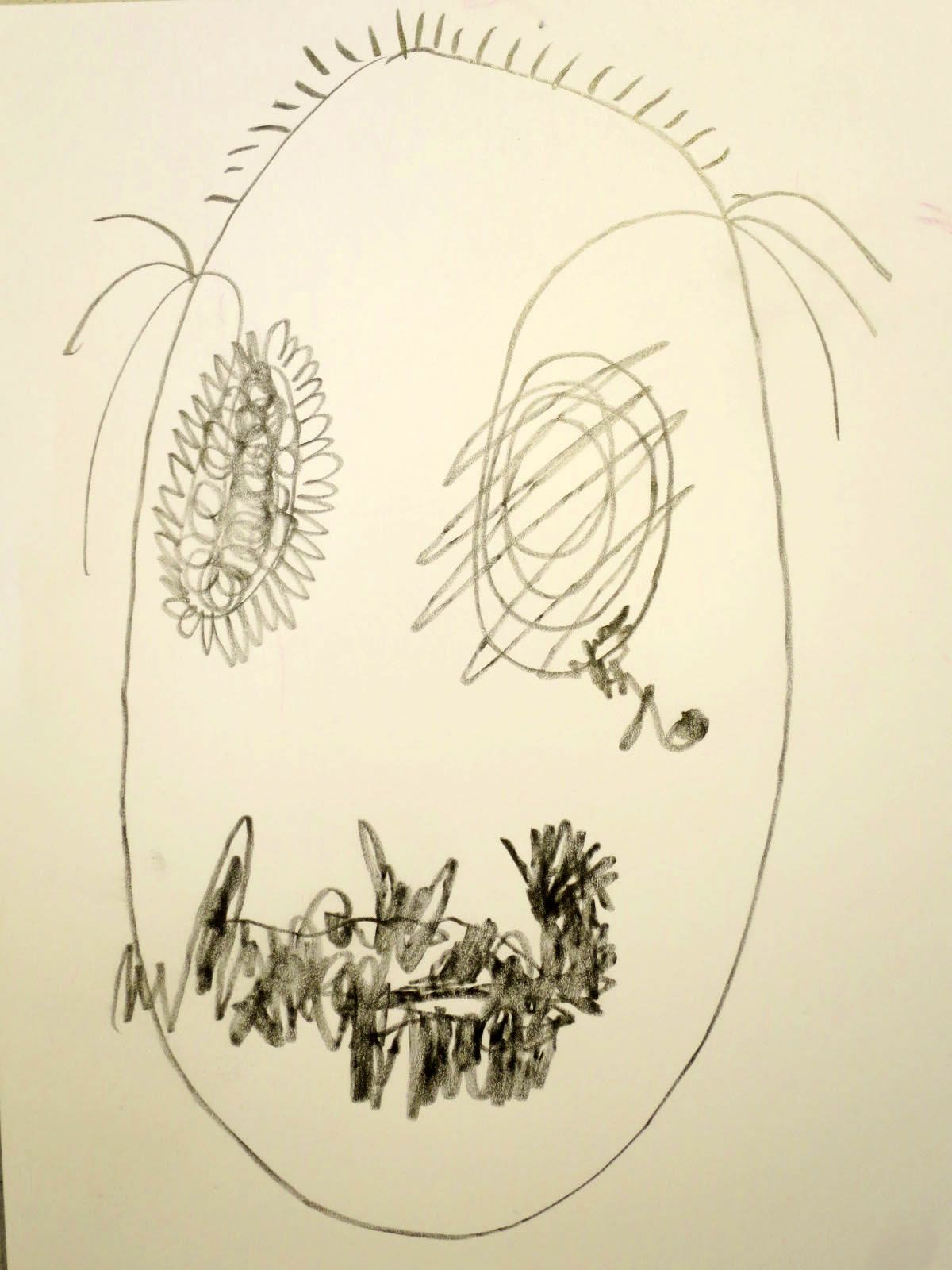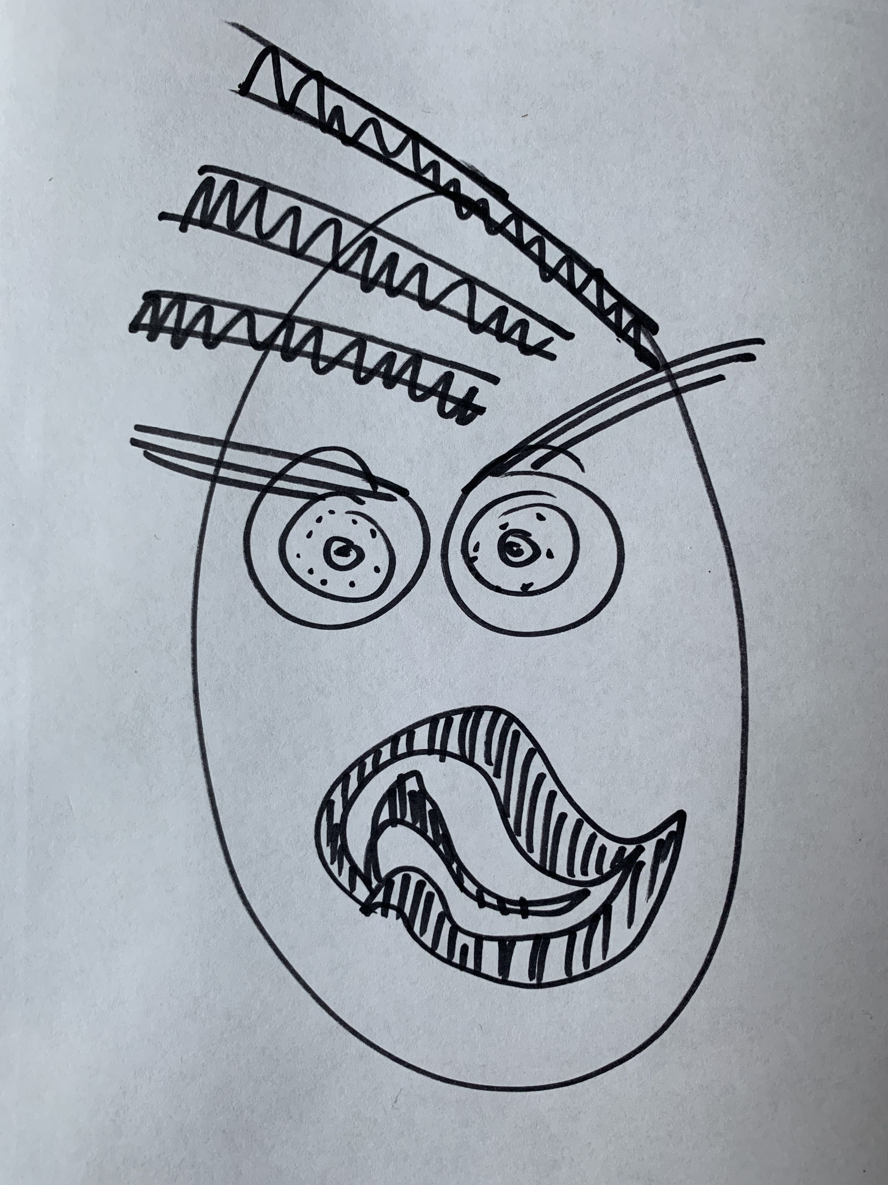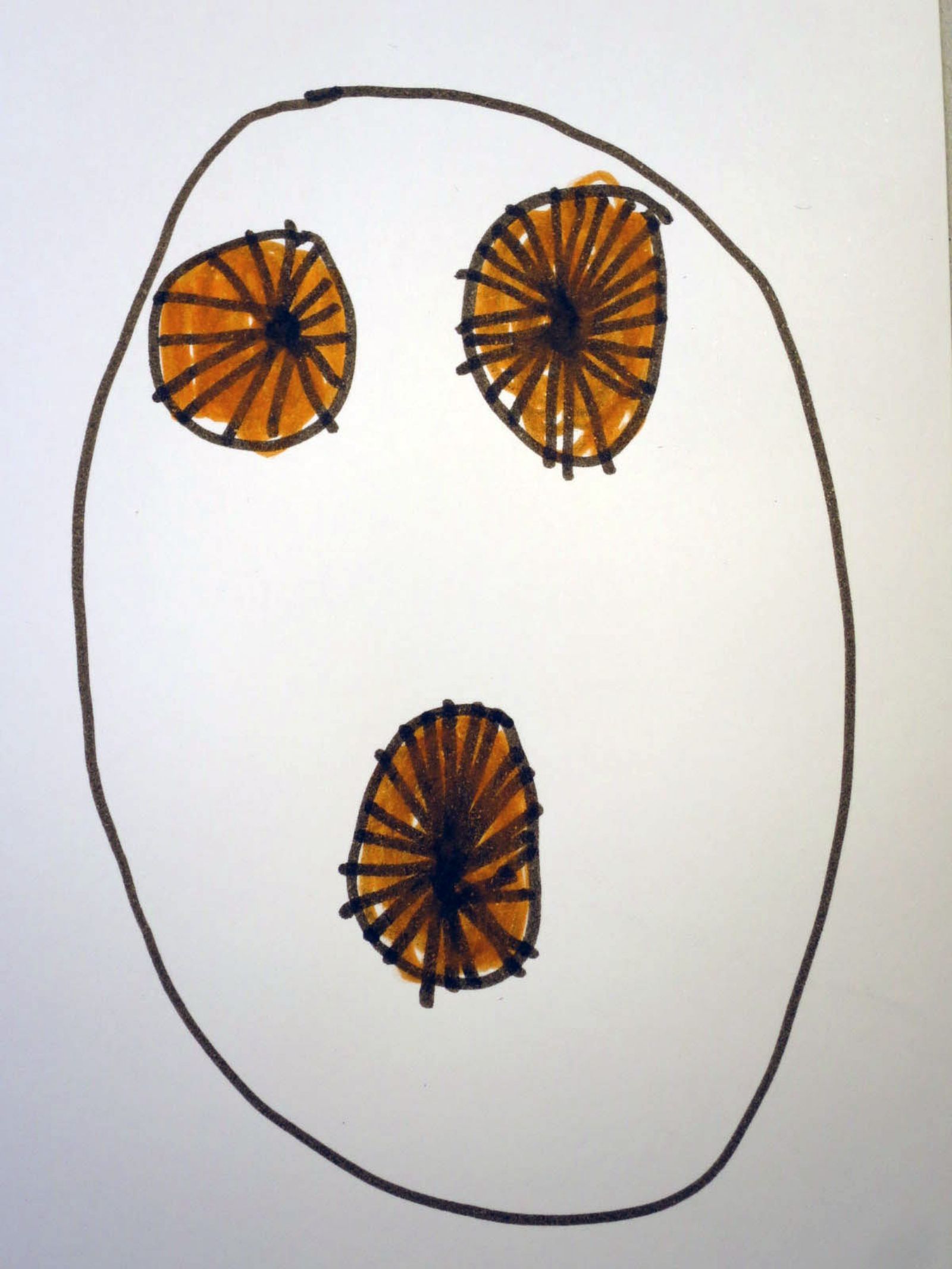Zeichne ein Oval im Hochformat und ergänze es mit Formen so dass ein bizarres Gesicht zu erkennen oder zu erahnen ist. Das Bild kann gezeichnet, geklebt, gemalt, gelegt, gestempelt oder ... werden.